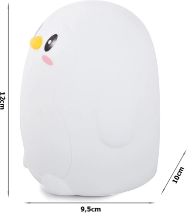Pingvin svijetli u pet različitih boja – bijela, crvena, zelena, plava i glatka promjena boja zahvaljujući RGB tehnologiji. Boje se mogu mijenjati dodirom ili tapkanjem po pingvinu. Napajanje osiguravaju AAA baterije (uključene u paket). Poklopac se lako skida i može se oprati vodom.