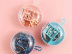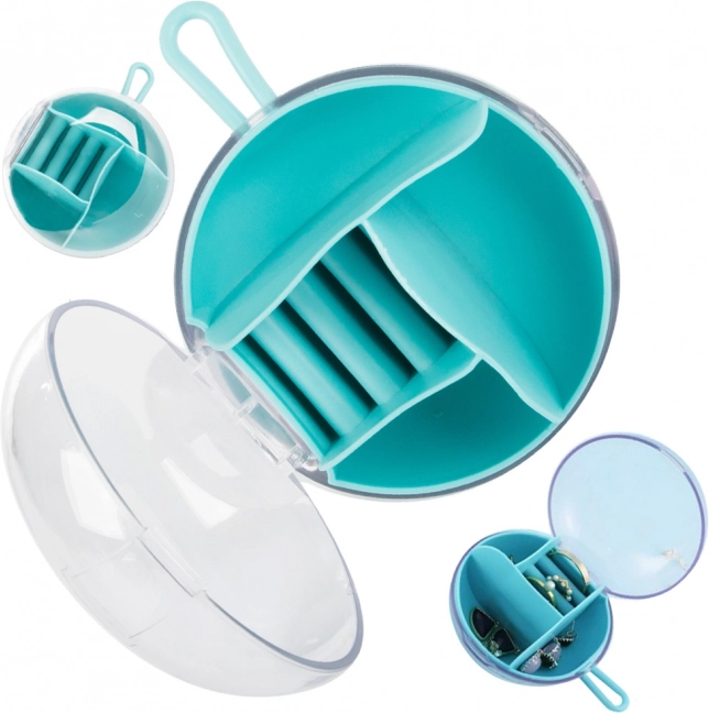 Ova elegantna putna kutija za nakit pomaže zadržati vaše dragocjenosti sigurnima i uredno organiziranima. Okrugla kutija od izdržljive plastike ima različite vrste i veličine pretinaca, uključujući držače za prstenje, pa svaki komad ima svoje mjesto. Prozirni poklopac omogućuje brzu provjeru sadržaja bez otvaranja, a gumeni remenčić osigurava udobno nošenje.
