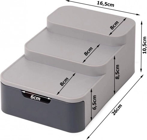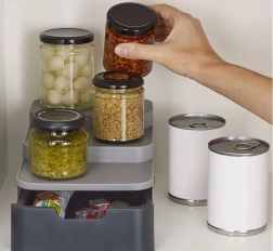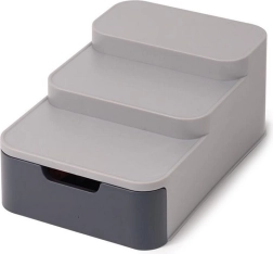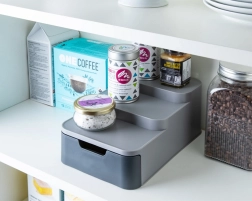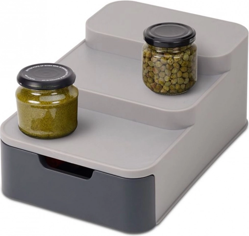 Ovaj kompaktni organizator učinkovito iskorištava prostor u vašoj ostavi ili ormariću. Tri razine osiguravaju bolju vidljivost staklenki i konzervi u stražnjem redu, dok izvlačna ladica prima vrećice, tube i druge sitnice. Izdržljiva siva plastika lako se čisti i odlično se uklapa u modernu kuhinju.