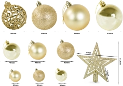 U setu ćete naći ukrase promjera od 30 mm do 60 mm i jednu Betlehemsku zvijezdu dimenzija 13,5 cm x 14 cm. Svi su upakirani u estetski kovčeg koji omogućuje jednostavno skladištenje.
