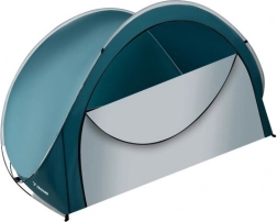 Uživajte u udobnosti i sjeni gdje god ste uz vodu. Plažni šator s poluzatvorenom konstrukcijom spaja prednosti suncobrana i paravana, a zauzima minimalno mjesta u prtljazi. Rasklapanje u 2 sekunde može svatko – nakon vađenja iz torbe šator se sam postavi, a osigurava se pomoću klinova i užadi.