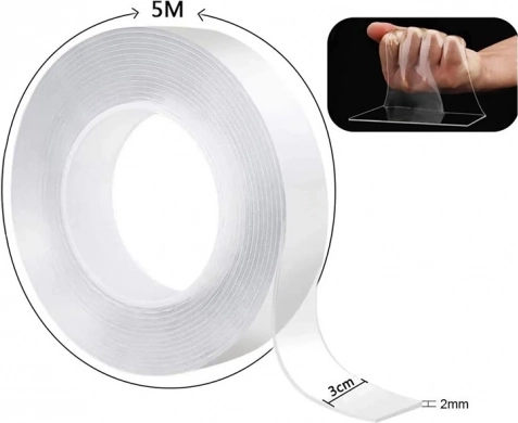 Prozirna obostrana nano traka 5 m, periva i bez ostavljanja ostataka. Idealna za kućnu upotrebu na glatkim površinama.