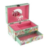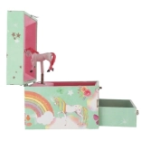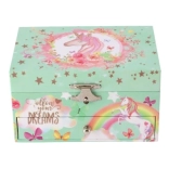 Čarobna glazbena kutijica za nakit s motivom jednoroga u pastelnim zelenim tonovima razveselit će svaku malu ljubiteljicu nakita. Nakon navijanja ključića unutra se zavrti figurica jednoroga i zazvuči nježna melodija. Unutra ćete pronaći zrcalo, pregledne pretince i praktičnu ladicu za sitne dragocjenosti. Izdržljiva kartonska konstrukcija, metalni elementi i dražesne ilustracije duge, zvjezdica i leptira savršeno će upotpuniti dječju sobu.