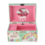 Ova stilska glazbena kutijica s jednorogom idealna je za pohranu prstenja, naušnica i malih tajni. Nakon otvaranja poklopca sa zrcalom i navijanja ključića, bijelo‑ružičasti jednorog se zavrti i zazvuči nježna glazba. Unutrašnjost nudi organiziran prostor za nakit, dok donja ladica prima dodatne dragocjenosti.