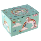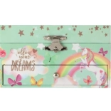 Pastelno zelenu površinu krase motivi duga, zvjezdica i leptira. Kutijica je od čvrstog kartona, dopunjena metalnim zatvaranjem i izdržljivim šarkama za dulji vijek trajanja. Sjajan poklon za dječju sobu – lijepa na pogled i ujedno praktična.